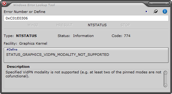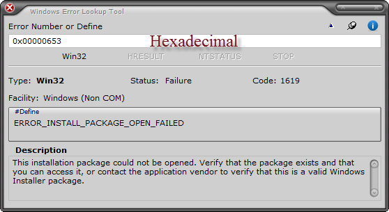 Simple enough, windows will display a value in either Decimal or Hex for Win32, HRESULT, NTSTATUS and STOP error codes (For the Developer, this can be the return value of an API call or from GetLastError). Type in an error code and WELT will display the Facility, Status, Code, Define, and Description for the error. You also have the option to create a note for an error (so you can keep track of what you have done to create the error) I have removed the notes for now, if you request it, I will add it back.